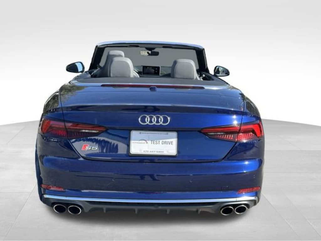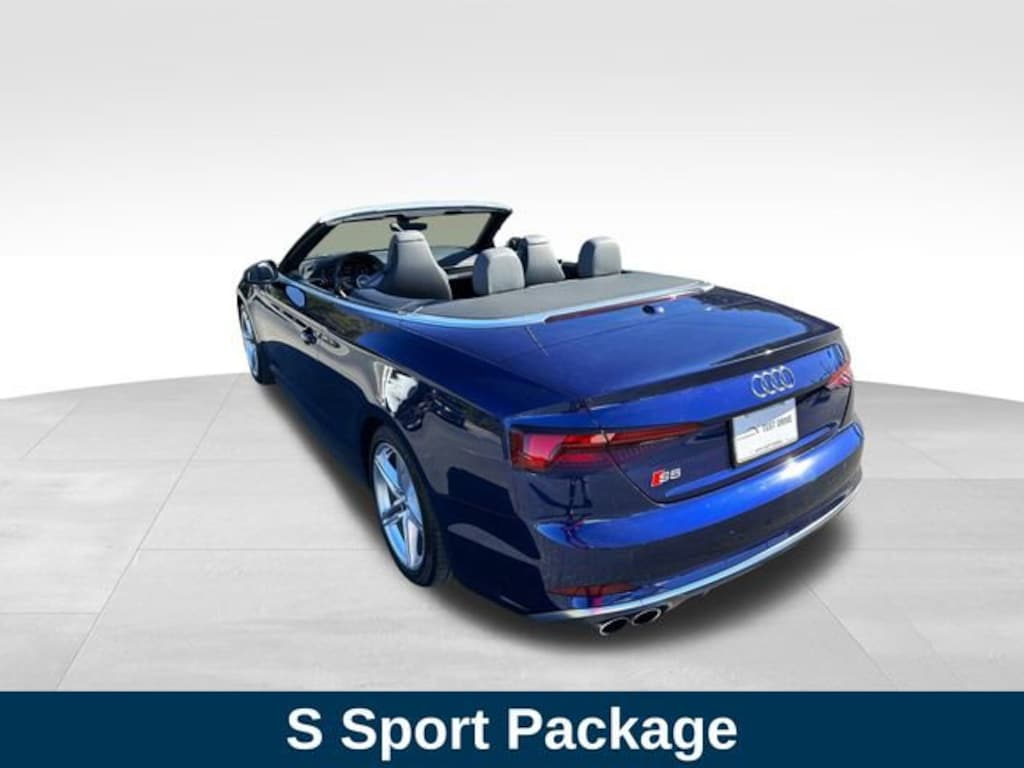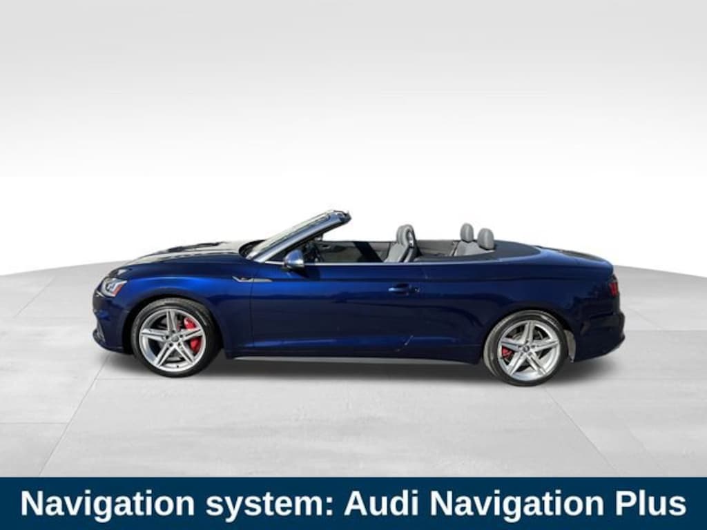 Navarra Blue Metallic/Black Roof 2019 Audi S5 3.0T Premium Plus quattro 3.0L TFSI 8-Speed Automatic with Tiptronic quattro 10 Speakers, AM/FM radio: SiriusXM, Audi smartphone interface (Apple CarPlay/Android Auto), Auto-dimming door mirrors, Auto-dimming Rear-View mirror, Brake assist, Compass, Convertible roof lining, Convertible roof wind blocker, Delay-off headlights, Driver vanity mirror, Dual front side impact airbags, Electronic Stability Control, Exterior Parking Camera Rear, Fine Nappa Seating Surfaces, Front & Rear Red Brake Calipers, Front Bucket Seats, Front Center Armrest, Front dual zone A/C, Garage door transmitter: HomeLink, Glass rear window, Headlight cleaning, Heated Front S Sport Seats, Heated front seats, Illuminated entry, Leather Shift Knob, Low tire pressure warning, Memory seat, Navigation system: Audi Navigation Plus, Outside temperature display, Panic alarm, Passenger door bin, Passenger vanity mirror, Power door mirrors, Power driver seat, Power passenger seat, Power steering, Rear air conditioning, Rear reading lights, Remote keyless entry, S Sport Package, Security system, Speed control, Speed-Sensitive Wipers, Split folding rear seat, Sport Adaptive Damping Suspension, Sport Rear Differential, Tilt steering wheel, Traction control, Turn signal indicator mirrors, Wheels: 18 x 8.5 5-Double-Spoke-Star Design.