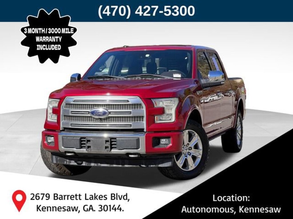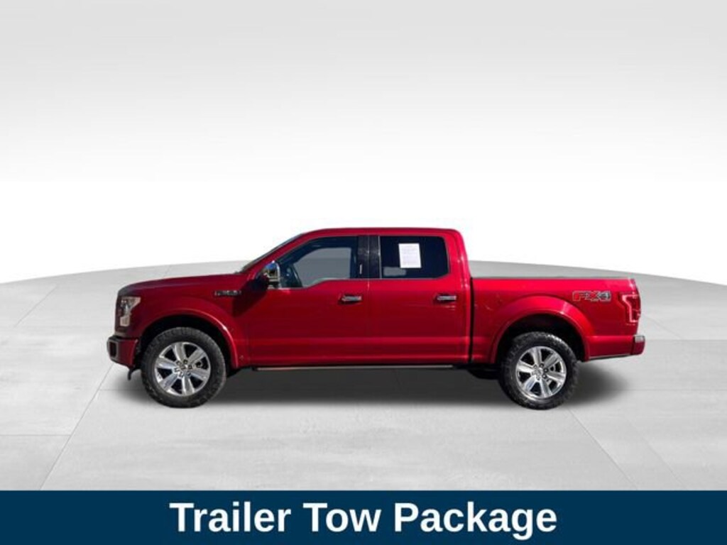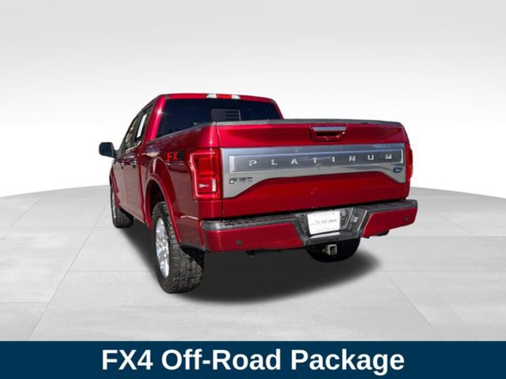 Ruby Red Metallic Tinted Clearcoat 2017 Ford F-150 Platinum 5.0L V8 FFV 6-Speed Automatic Electronic 4WD 4WD, 10 Speakers, 20 Polished Aluminum Wheels, 4-Wheel Disc Brakes, 4x4 FX4 Off-Road Bodyside Decal, Adaptive Cruise Control & Collision Warning, Adjustable pedals, AM/FM radio: SiriusXM, Auto tilt-away steering wheel, Auxiliary Transmission Oil Cooler, Class IV Trailer Hitch Receiver, Compass, Driver door bin, Electronic Locking w/3.31 Axle Ratio, Electronic Stability Control, Engine Oil Cooler, Equipment Group 701A Luxury, Exterior Parking Camera Rear, Front Bucket Seats, Front Center Armrest, FX4 Off-Road Package, Heated front seats, Hill Descent Control, Integrated Trailer Brake Controller, Lane-Keeping System, Low tire pressure warning, Off-Road Tuned Front Shock Absorbers, Passenger door bin, Pro Trailer Backup Assist, Radio data system, Rear Parking Sensors, Security system, Speed control, Tailgate Step w/Tailgate Lift Assist, Technology Package, Traction control, Trailer Tow Package, Turn signal indicator mirrors, Twin Panel Moonroof, Upgraded Front Stabilizer Bar.